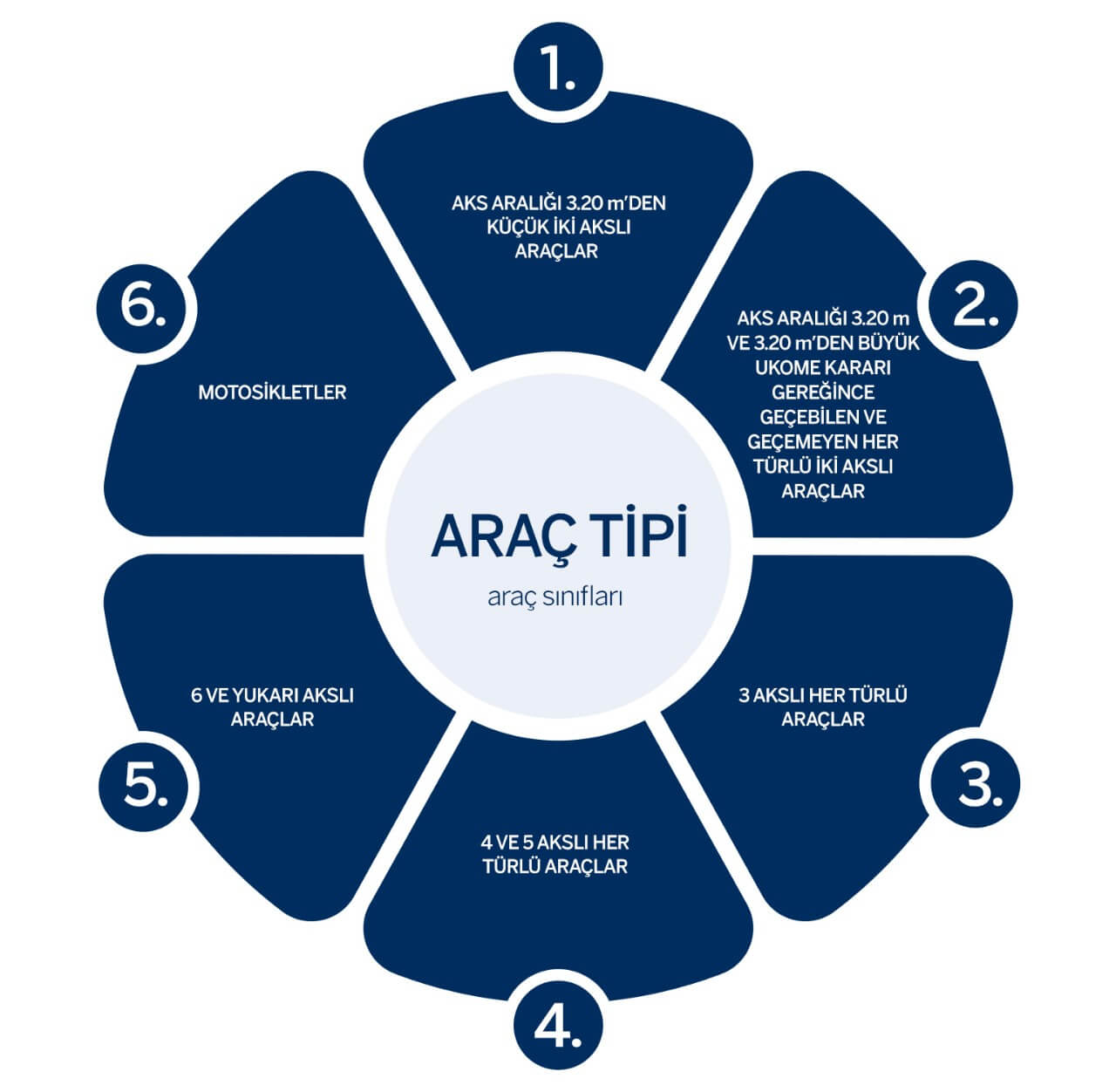1. sınıf araçlar kategorisinde otomobiller, 2. sınıf araç kategorisinde minibüsler, 3. sınıf araç kategorisinde yolcu otobüsleri, 4. sınıf araç kategorisinde kamyonlar, 5. sınıf araç kategorisinde ise tır ve treyler bulunuyor. Ancak araç sınıfları belirlenirken sahip olduğu aks adedinin belirleyici olduğunu hatırlatalım.
